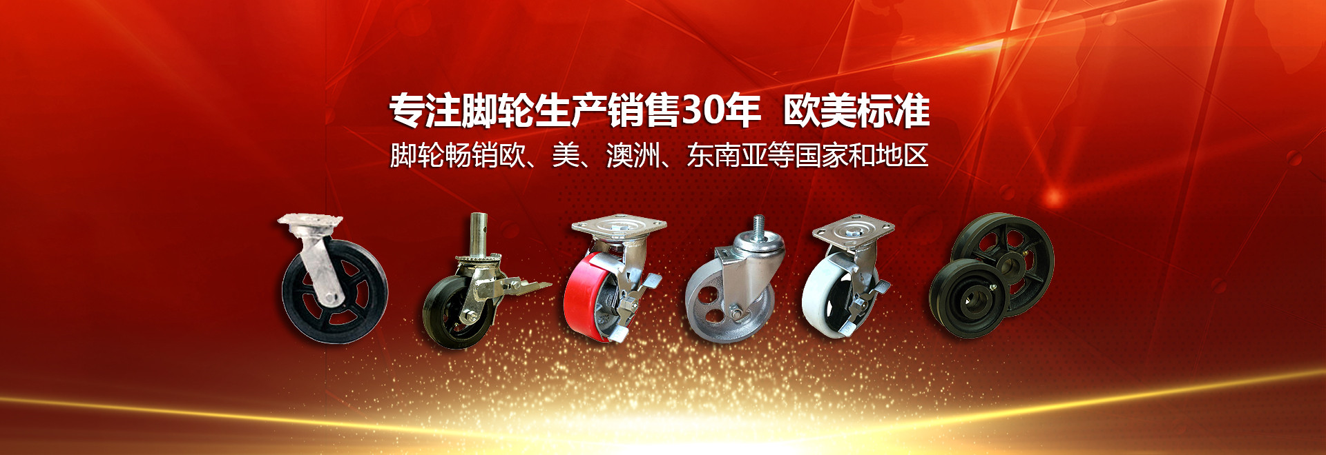 公司專注從事重型腳輪等產品的生產和研究達30余年,產品均按照歐美發達國家標準設計和制造。多年來,我公司生產的系列腳輪及相關輪類產品和五金制品一直暢銷歐、美、澳洲、東南亞等國家和地區。